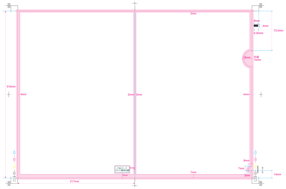 印刷領域について 下記のピンク色の箇所には印刷ができませんのでご注意ください。 上記ピンクの部分が印字不可領域となりますので、デザイン頂く際はピンクの内側にデザインください。※印字不可領域はデザイン出来ないようになっています。